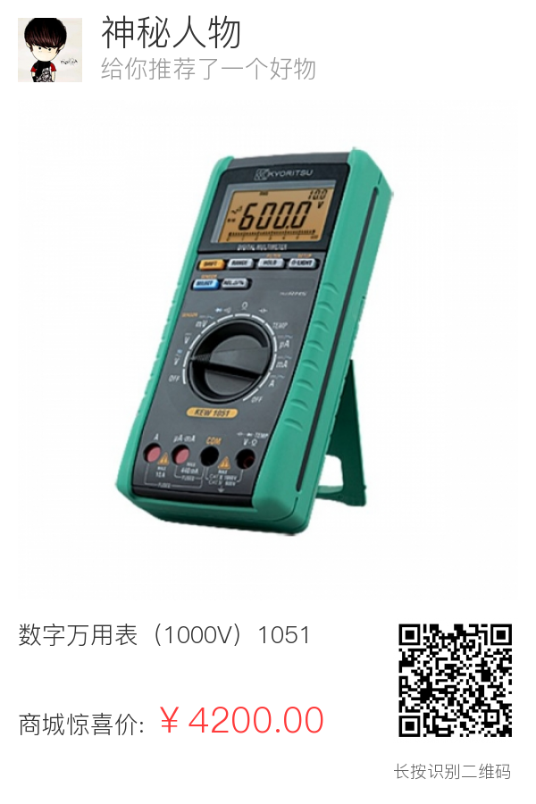 条形图显示:31 DC电压测试 600mV-1000V AC电压测试 600mV-1000V AC频率带宽 40Hz-1kHz 频率测试 10Hz-99.99kHz 检测模式 真有效值 真有效值/平均值(ACV,ACmV) 电阻测试 600Ω/60MΩ 电容测试 10 nF -1000uF 温度测试 -50℃-600℃(热电偶型K) 电流测试 600uA-10A 导通测试 有 二极管测试 有 低通滤波 有 数据保留 有 自动保留 有 量程保留 有 相对值 有 最大值/最小值 没有 有 内存保存数据 没有 保存:100个数据/记录1600个数据 通信 没有 使用DMM打印输出在PC上实时监控 LCD 有 端口盖 有 操作温度 -10℃-55℃ 保存温度 -30℃-75℃ 使用电池 AA(R6/LR6)1.5V电池×4 外形尺寸 约192(L)×90(W) ×49(D)mm 重量 约560g(含电池) 安全规格 IEC/EN61010-1CAT.III100V/CAT.IV600V污染度2,IEC/EN61010-031,IEC61326-1(EMC) 附件 AA(R6/LR6)1.5V电池×4,7220A(测试线),8926(保险丝:440mA/1000V);8927(保险丝:10A/1000V);